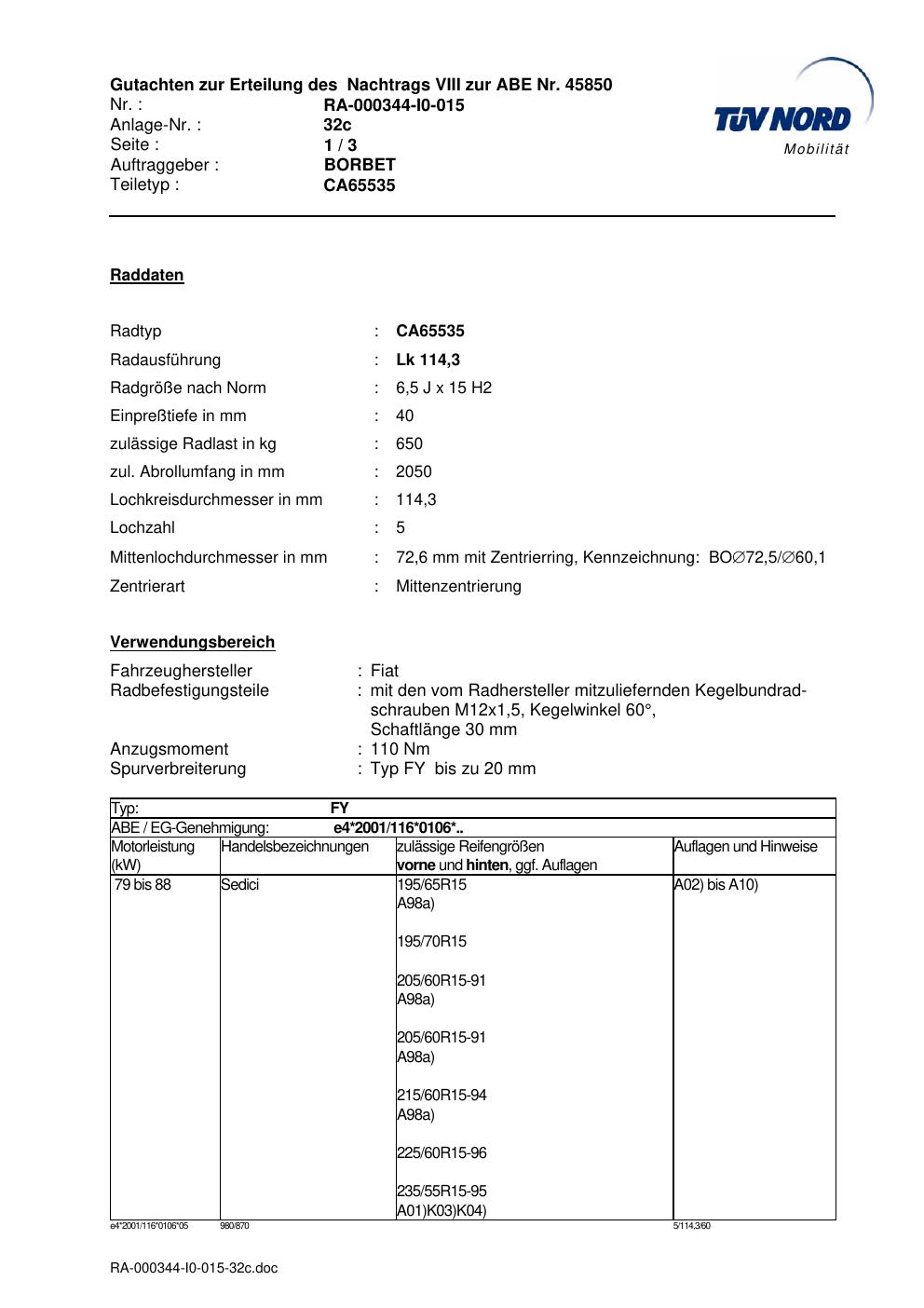 Dieses Gutachten (abe) bezieht sich auf die Alufelge Borbet CA65535 in der Ausführung 6.5Jx15 ET 0, Mittenloch 0 mm (KBA 45850). Im PDF findest du typischerweise zulässige Reifengrößen, Auflagen/Anbauhinweise und – je nach Dokument – Hinweise zur Eintragung.