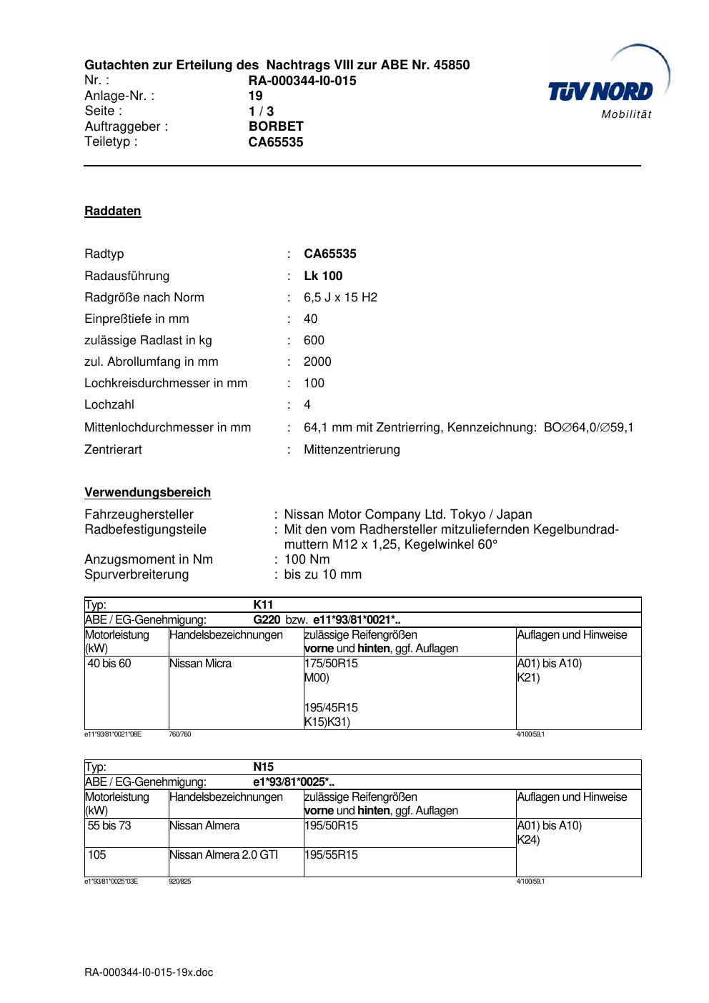 Dieses Gutachten (abe) bezieht sich auf die Alufelge Borbet CA65535 in der Ausführung 6.5Jx15 ET 0, Mittenloch 0 mm (KBA 45850). Im PDF findest du typischerweise zulässige Reifengrößen, Auflagen/Anbauhinweise und – je nach Dokument – Hinweise zur Eintragung.
