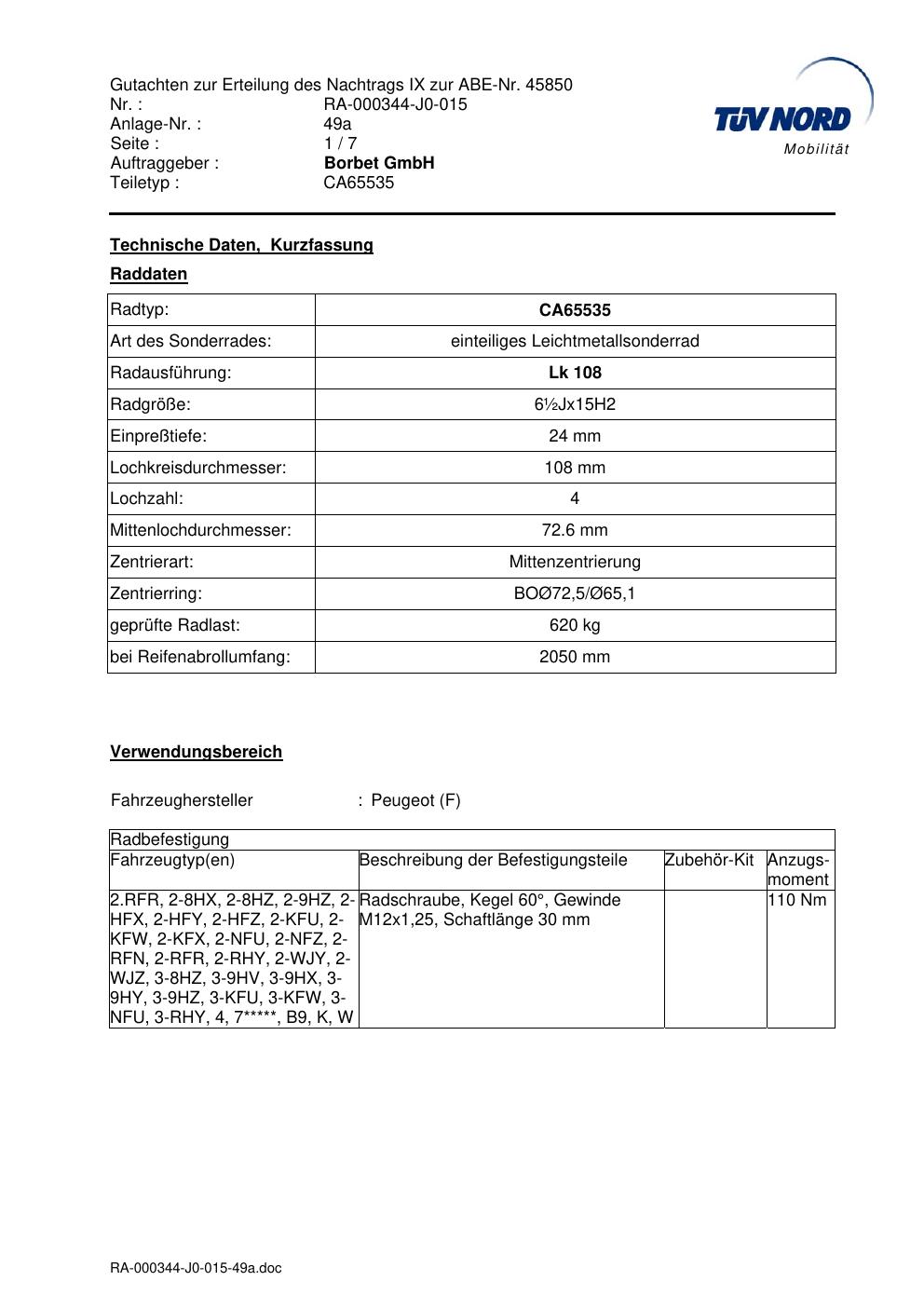 Dieses Gutachten (abe) bezieht sich auf die Alufelge Borbet CA65535 in der Ausführung ET 0, Mittenloch 0 mm (KBA 45850). Im PDF findest du typischerweise zulässige Reifengrößen, Auflagen/Anbauhinweise und – je nach Dokument – Hinweise zur Eintragung.