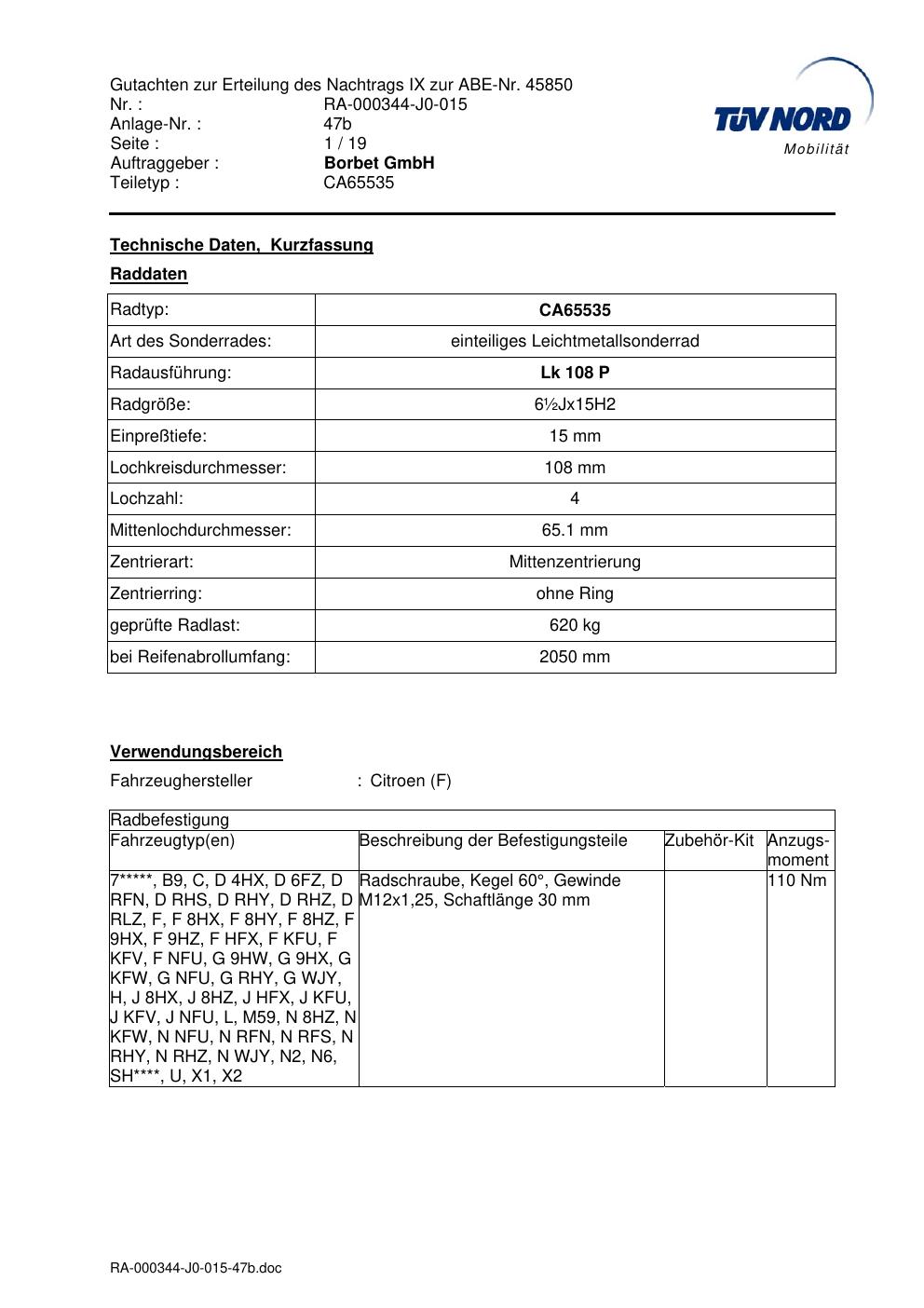 Dieses Gutachten (abe) bezieht sich auf die Alufelge Borbet CA65535 in der Ausführung ET 0, Mittenloch 0 mm (KBA 45850). Im PDF findest du typischerweise zulässige Reifengrößen, Auflagen/Anbauhinweise und – je nach Dokument – Hinweise zur Eintragung.