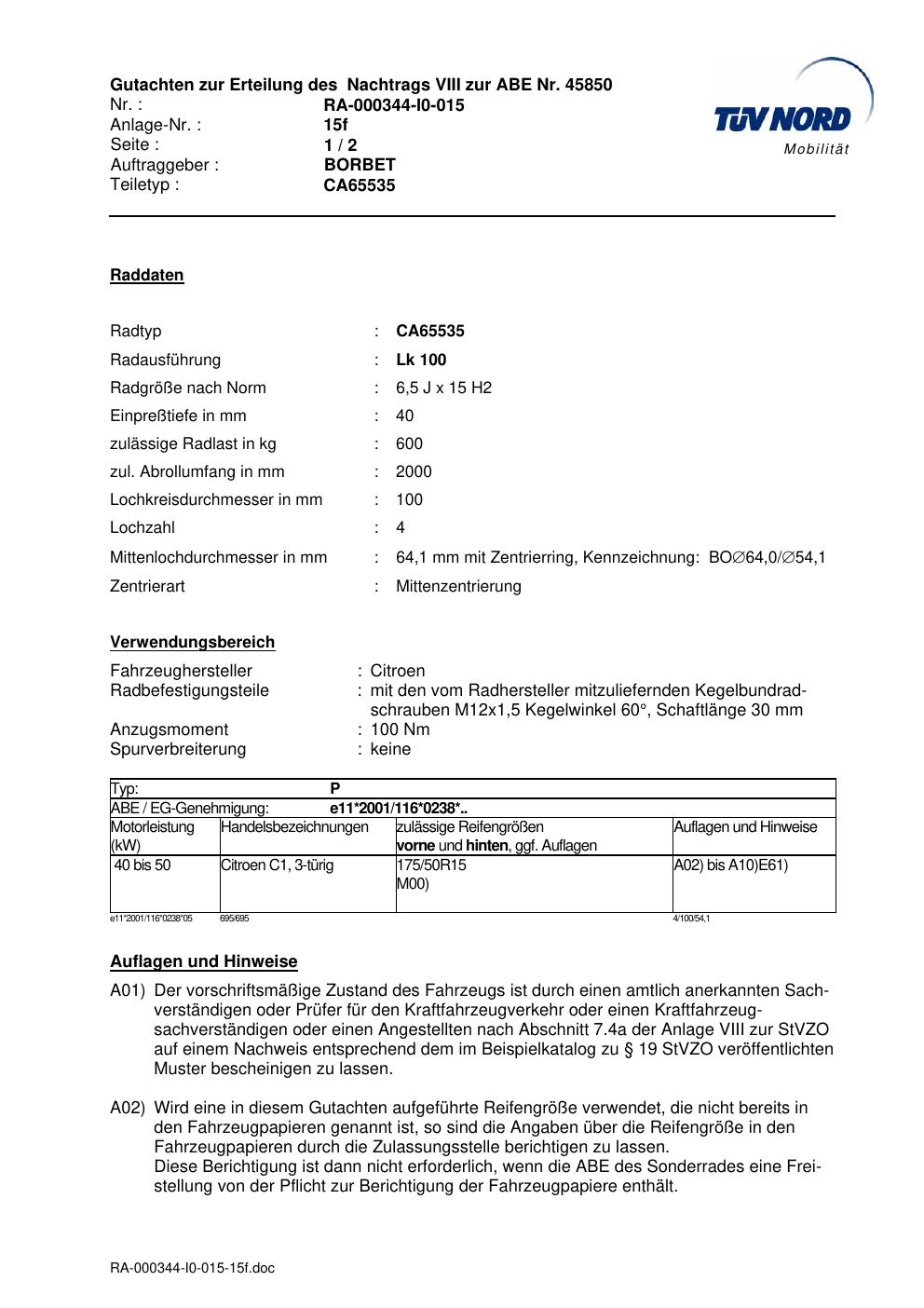 Dieses Gutachten (abe) bezieht sich auf die Alufelge brand-borbet CA65535 in der Ausführung 6.5Jx15 ET 0, Mittenloch 0 mm (KBA 45850). Im PDF findest du typischerweise zulässige Reifengrößen, Auflagen/Anbauhinweise und – je nach Dokument – Hinweise zur Eintragung.
