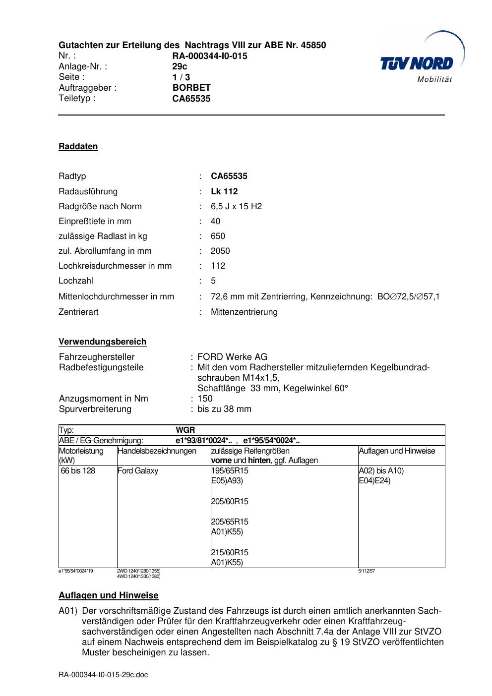Dieses Gutachten (abe) bezieht sich auf die Alufelge Borbet CA65535 in der Ausführung 6.5Jx15 ET 0, Mittenloch 0 mm (KBA 45850). Im PDF findest du typischerweise zulässige Reifengrößen, Auflagen/Anbauhinweise und – je nach Dokument – Hinweise zur Eintragung.