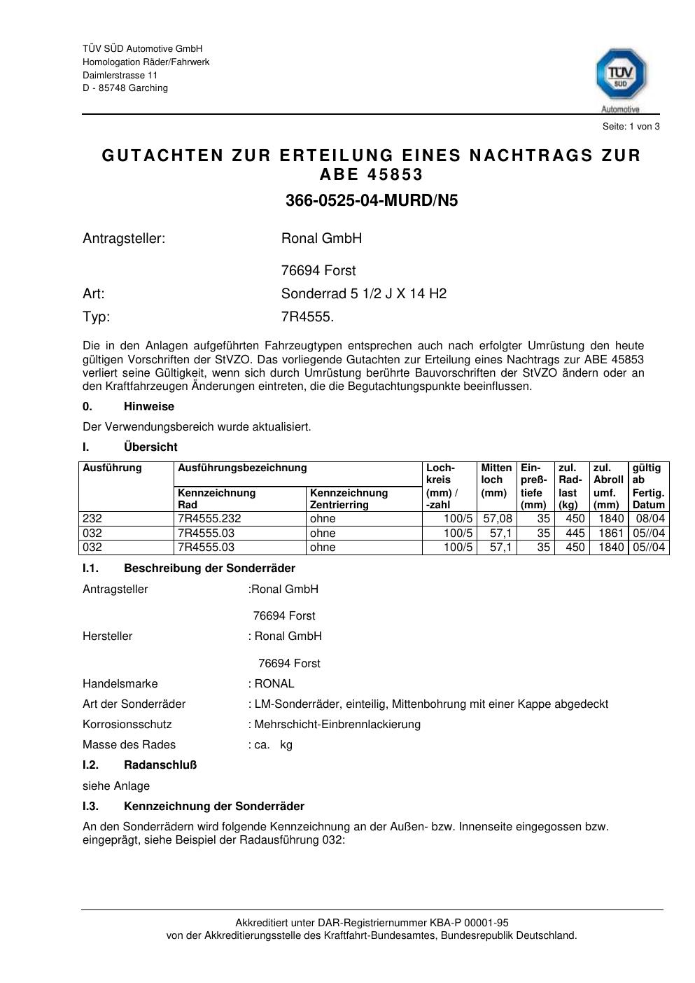 Dieses Gutachten (abe) bezieht sich auf die Alufelge Ronal 7R4555 in der Ausführung 2Jx14 ET 0, Mittenloch 0 mm (KBA 45853). Im PDF findest du typischerweise zulässige Reifengrößen, Auflagen/Anbauhinweise und – je nach Dokument – Hinweise zur Eintragung.