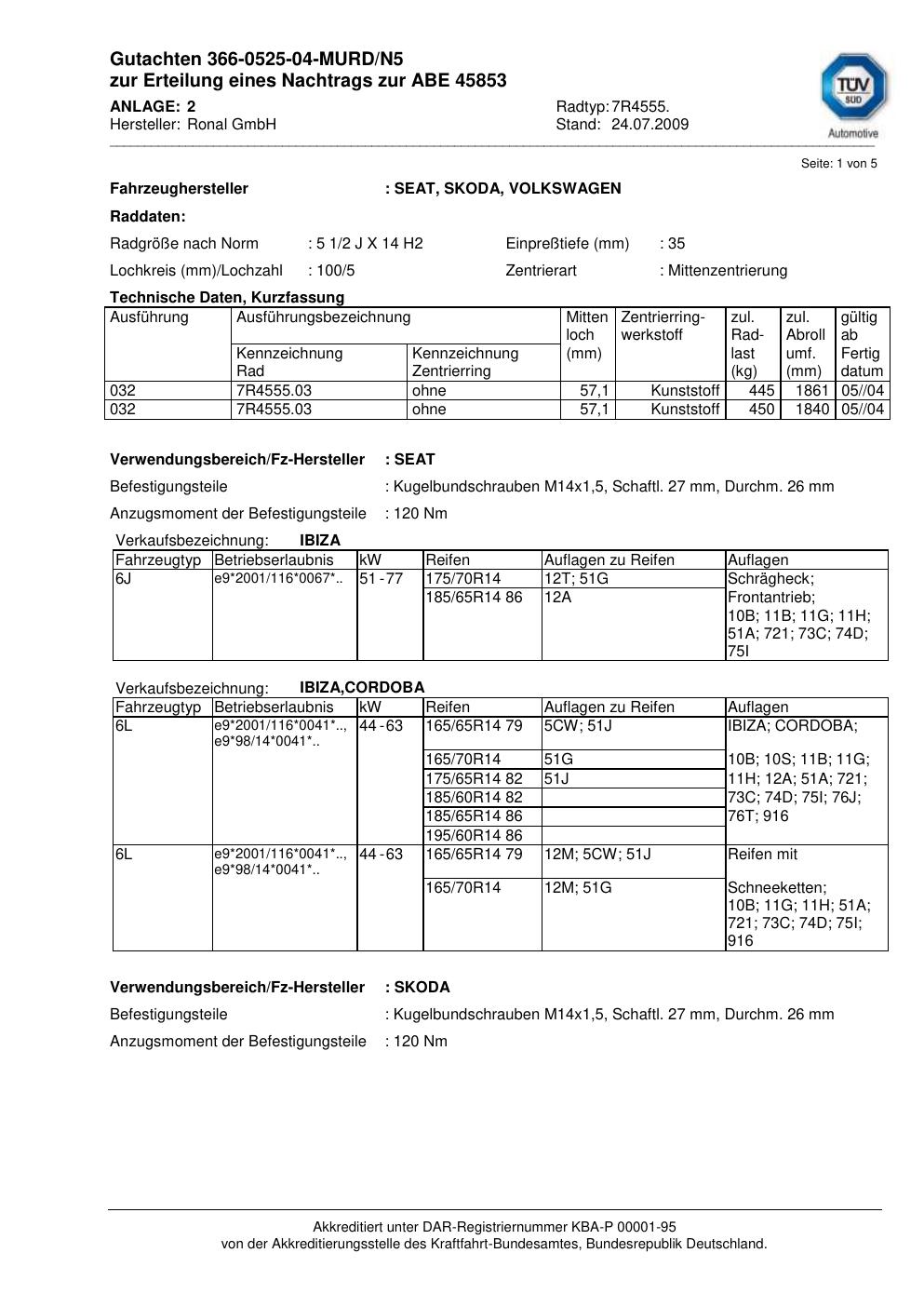 Dieses Gutachten (abe) bezieht sich auf die Alufelge Ronal 7R4555 in der Ausführung 2Jx14 ET 0, Mittenloch 0 mm (KBA 45853). Im PDF findest du typischerweise zulässige Reifengrößen, Auflagen/Anbauhinweise und – je nach Dokument – Hinweise zur Eintragung.