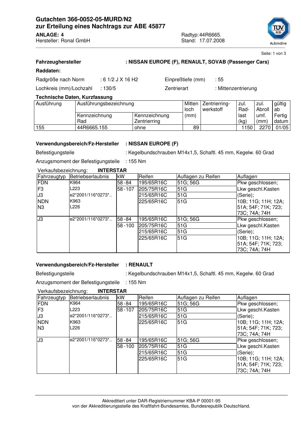 Dieses Gutachten (abe) bezieht sich auf die Alufelge Ronal 44R6665 in der Ausführung 2Jx16 ET 0, Mittenloch 0 mm (KBA 45877). Im PDF findest du typischerweise zulässige Reifengrößen, Auflagen/Anbauhinweise und – je nach Dokument – Hinweise zur Eintragung.