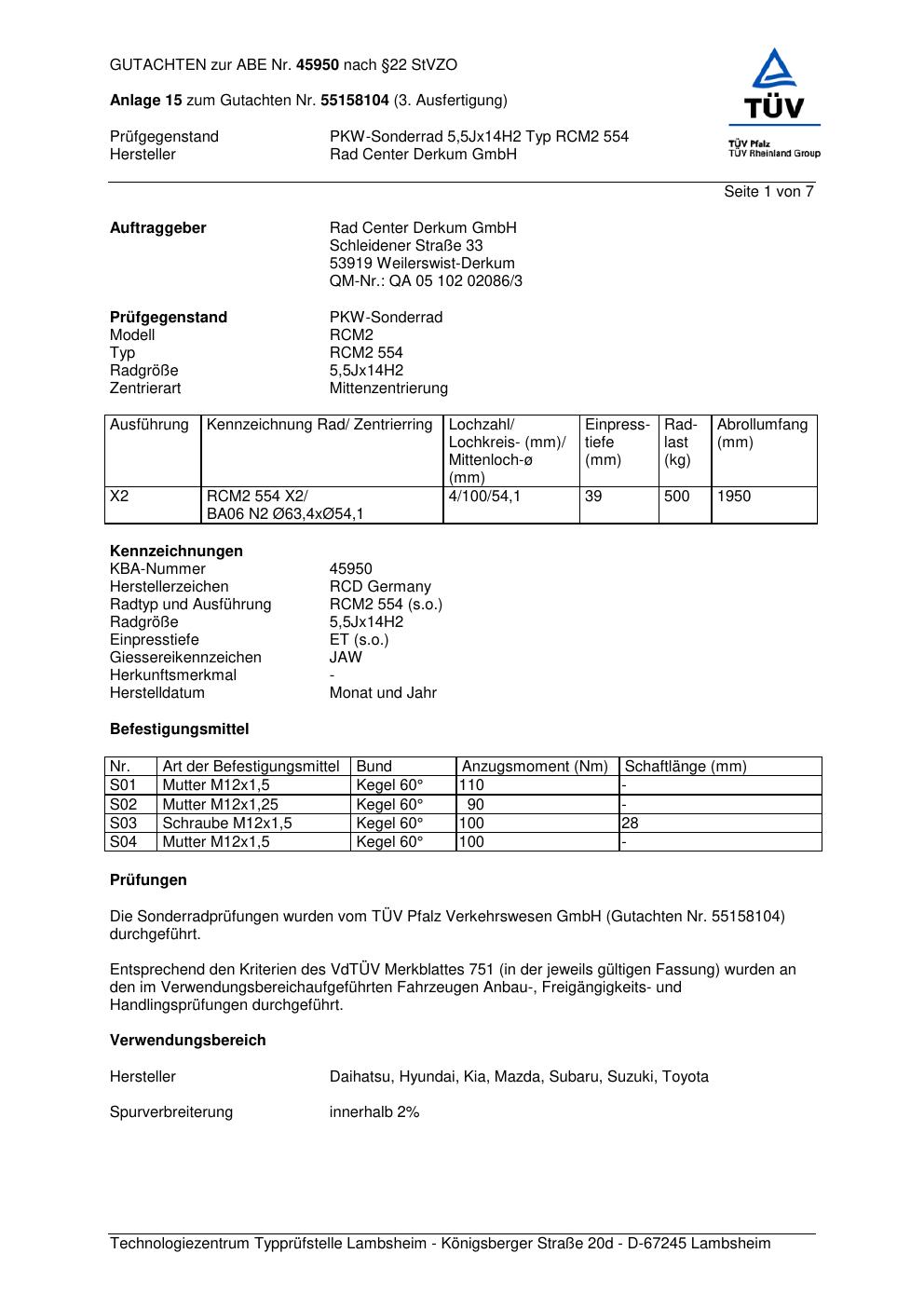 Dieses Gutachten (abe) bezieht sich auf die Alufelge ATS RCM2 554 in der Ausführung 5.5Jx14 ET 0, Mittenloch 0 mm (KBA 45950). Im PDF findest du typischerweise zulässige Reifengrößen, Auflagen/Anbauhinweise und – je nach Dokument – Hinweise zur Eintragung.