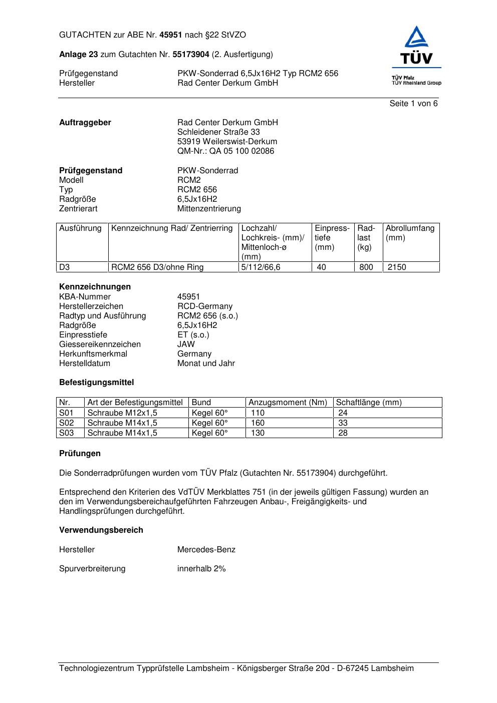 Dieses Gutachten (abe) bezieht sich auf die Alufelge ATS RCM2 656 in der Ausführung 6.5Jx16 ET 0, Mittenloch 0 mm (KBA 45951). Im PDF findest du typischerweise zulässige Reifengrößen, Auflagen/Anbauhinweise und – je nach Dokument – Hinweise zur Eintragung.