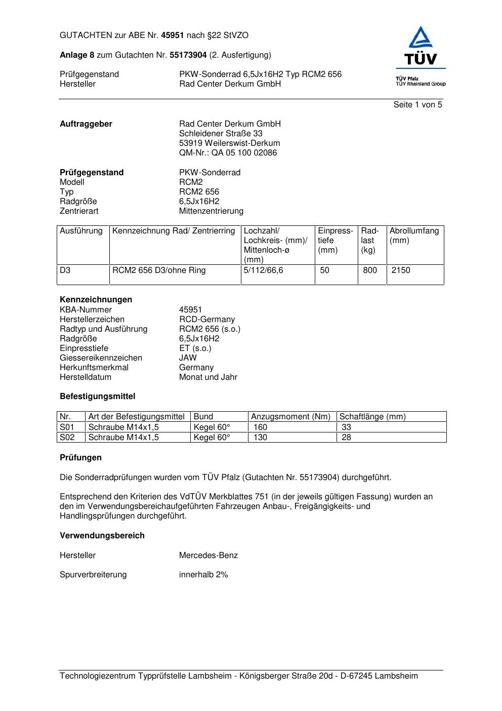 Dieses Gutachten (abe) bezieht sich auf die Alufelge ATS RCM2 656 in der Ausführung 6.5Jx16 ET 0, Mittenloch 0 mm (KBA 45951). Im PDF findest du typischerweise zulässige Reifengrößen, Auflagen/Anbauhinweise und – je nach Dokument – Hinweise zur Eintragung.