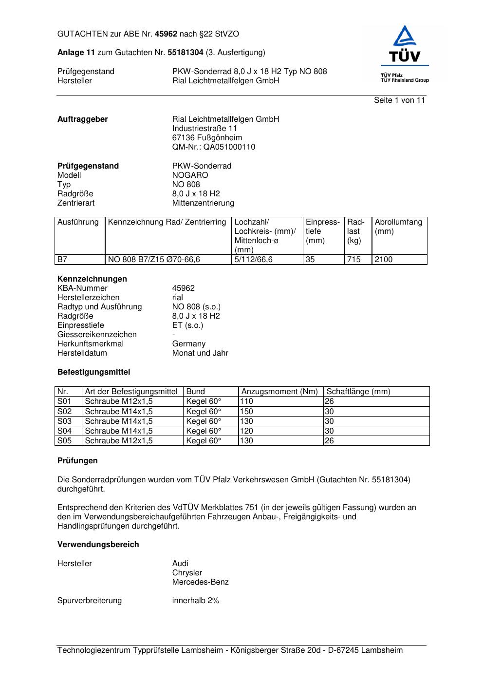 Dieses Gutachten (abe) bezieht sich auf die Alufelge brand-rial NO 8 08 in der Ausführung 8Jx18 ET 0, Mittenloch 0 mm (KBA 45962). Im PDF findest du typischerweise zulässige Reifengrößen, Auflagen/Anbauhinweise und – je nach Dokument – Hinweise zur Eintragung.