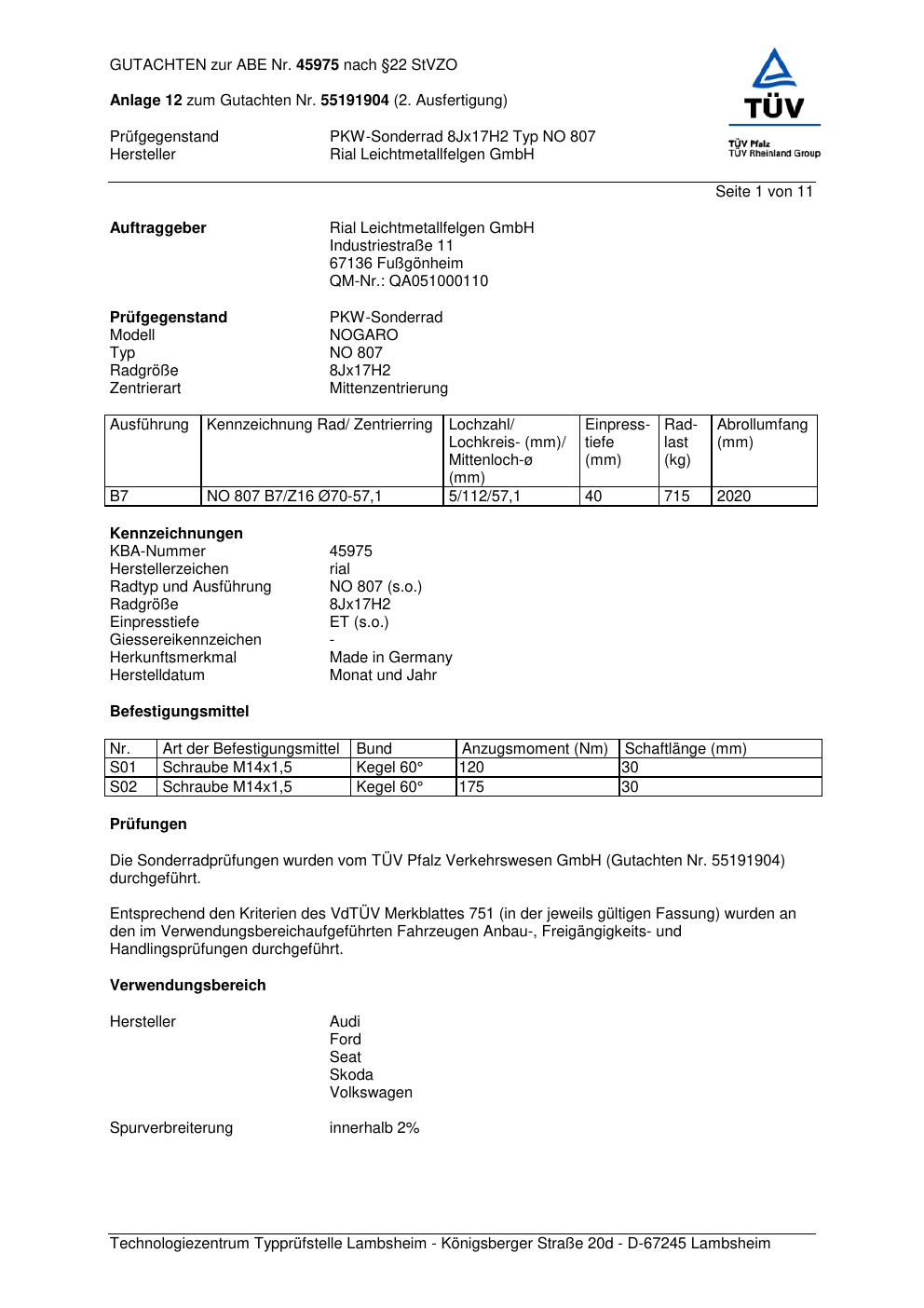 Dieses Gutachten (abe) bezieht sich auf die Alufelge brand-rial NO 807 in der Ausführung 8Jx17 ET 0, Mittenloch 0 mm (KBA 45975). Im PDF findest du typischerweise zulässige Reifengrößen, Auflagen/Anbauhinweise und – je nach Dokument – Hinweise zur Eintragung.