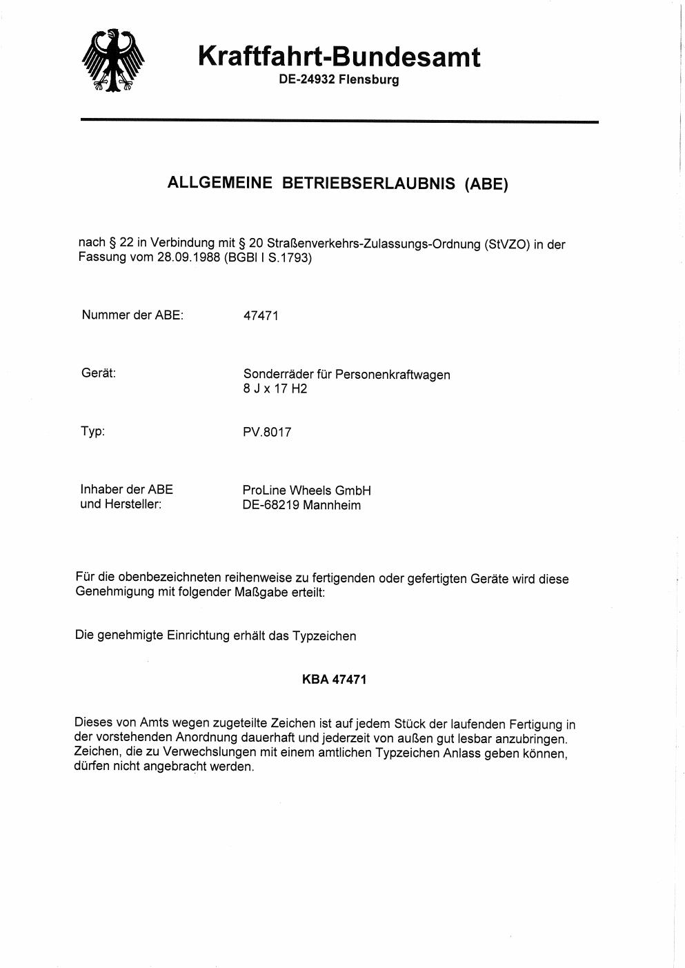 Dieses Gutachten (abe) bezieht sich auf die Alufelge Proline PV8017 in der Ausführung 8Jx17 ET 0, Mittenloch 0 mm (KBA 45997). Im PDF findest du typischerweise zulässige Reifengrößen, Auflagen/Anbauhinweise und – je nach Dokument – Hinweise zur Eintragung.