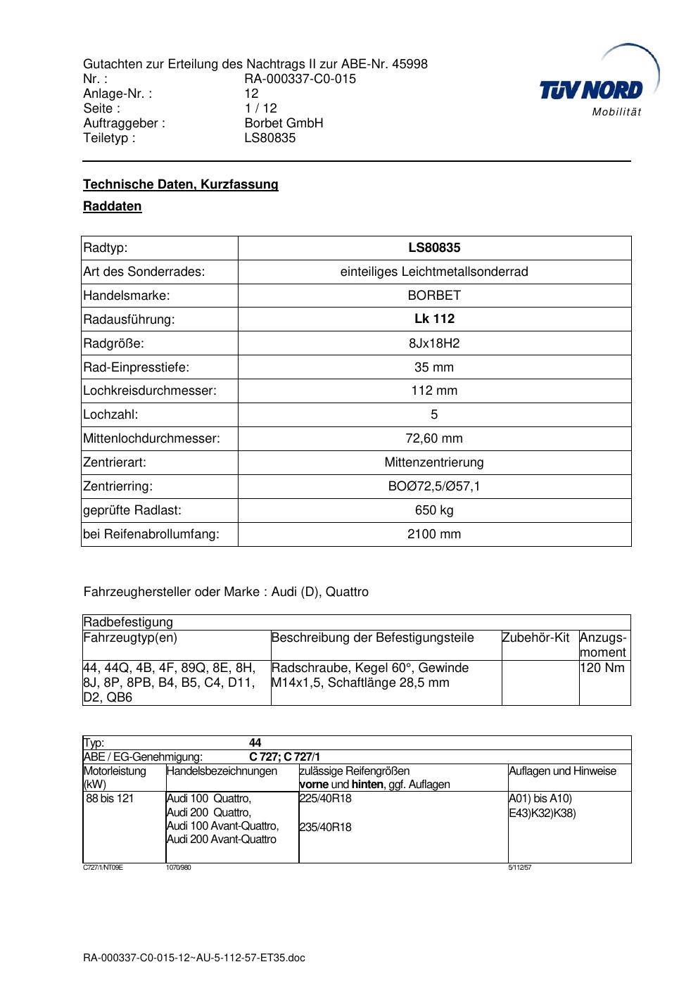 Dieses Gutachten (abe) bezieht sich auf die Alufelge brand-borbet LS80835 in der Ausführung 8Jx18 ET 0, Mittenloch 0 mm (KBA 45998). Im PDF findest du typischerweise zulässige Reifengrößen, Auflagen/Anbauhinweise und – je nach Dokument – Hinweise zur Eintragung.
