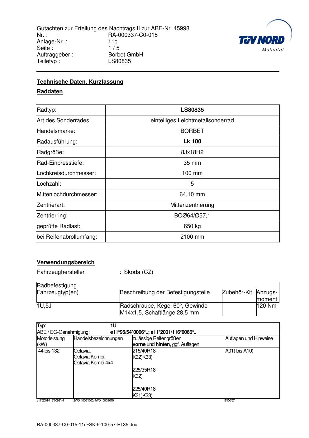 Dieses Gutachten (abe) bezieht sich auf die Alufelge brand-borbet LS80835 in der Ausführung 8Jx18 ET 0, Mittenloch 0 mm (KBA 45998). Im PDF findest du typischerweise zulässige Reifengrößen, Auflagen/Anbauhinweise und – je nach Dokument – Hinweise zur Eintragung.