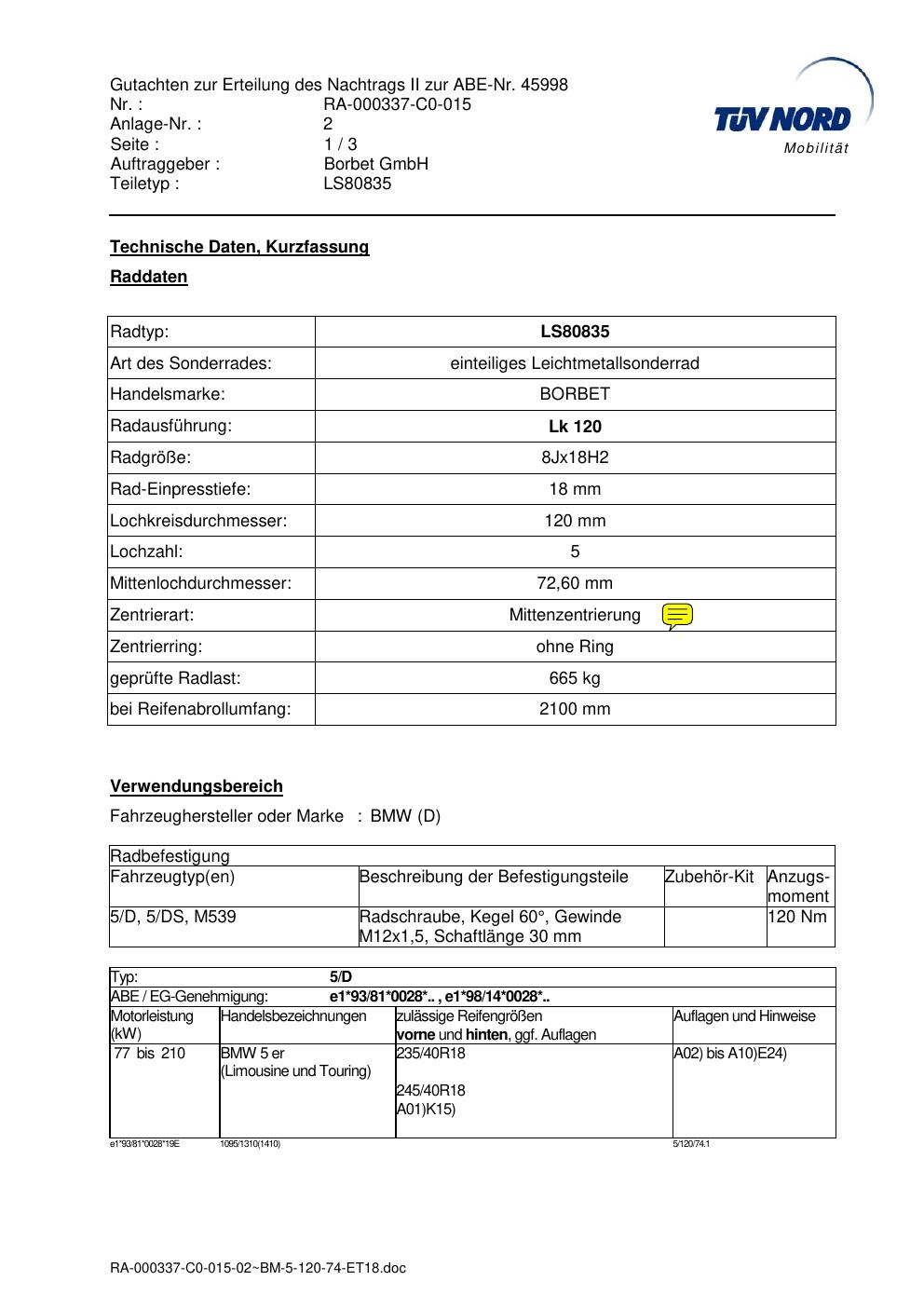 Dieses Gutachten (abe) bezieht sich auf die Alufelge brand-borbet LS80835 in der Ausführung 8Jx18 ET 0, Mittenloch 0 mm (KBA 45998). Im PDF findest du typischerweise zulässige Reifengrößen, Auflagen/Anbauhinweise und – je nach Dokument – Hinweise zur Eintragung.