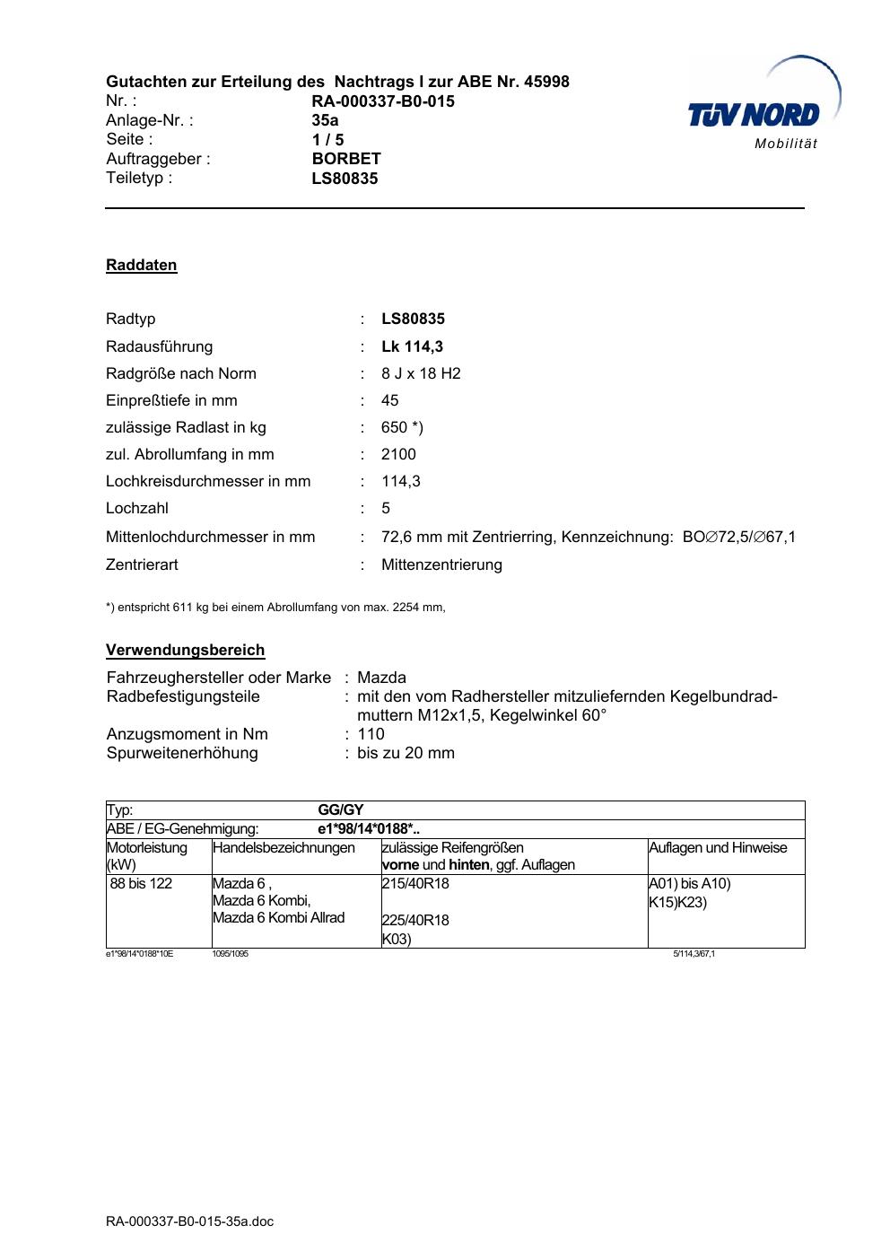 Dieses Gutachten (abe) bezieht sich auf die Alufelge brand-borbet LS80835 in der Ausführung 8Jx18 ET 0, Mittenloch 0 mm (KBA 45998). Im PDF findest du typischerweise zulässige Reifengrößen, Auflagen/Anbauhinweise und – je nach Dokument – Hinweise zur Eintragung.