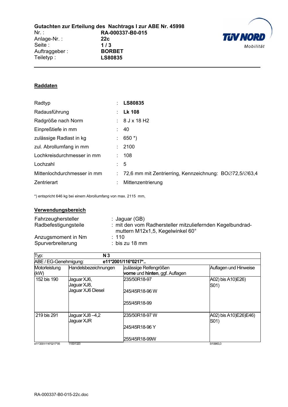 Dieses Gutachten (abe) bezieht sich auf die Alufelge brand-borbet LS80835 in der Ausführung 8Jx18 ET 0, Mittenloch 0 mm (KBA 45998). Im PDF findest du typischerweise zulässige Reifengrößen, Auflagen/Anbauhinweise und – je nach Dokument – Hinweise zur Eintragung.