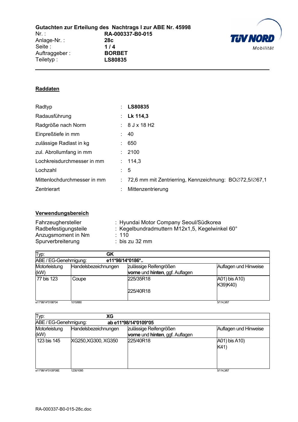 Felgengutachten / abe für Alufelgen Borbet LS80835 (8Jx18 ET 0, Mittenloch 0 mm) mit KBA 45998 (Zertifikatsnummer 45998). Hier kostenlos als PDF herunterladen. Der Download-Link ist 24 Stunden gültig und kann bis zu zwei Mal verwendet werden.