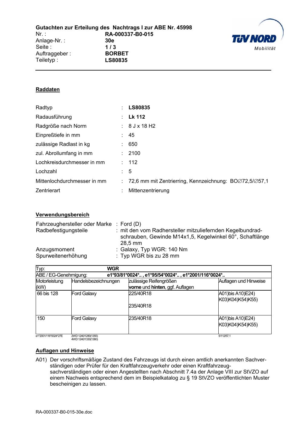 Dieses Gutachten (abe) bezieht sich auf die Alufelge brand-borbet LS80835 in der Ausführung 8Jx18 ET 0, Mittenloch 0 mm (KBA 45998). Im PDF findest du typischerweise zulässige Reifengrößen, Auflagen/Anbauhinweise und – je nach Dokument – Hinweise zur Eintragung.