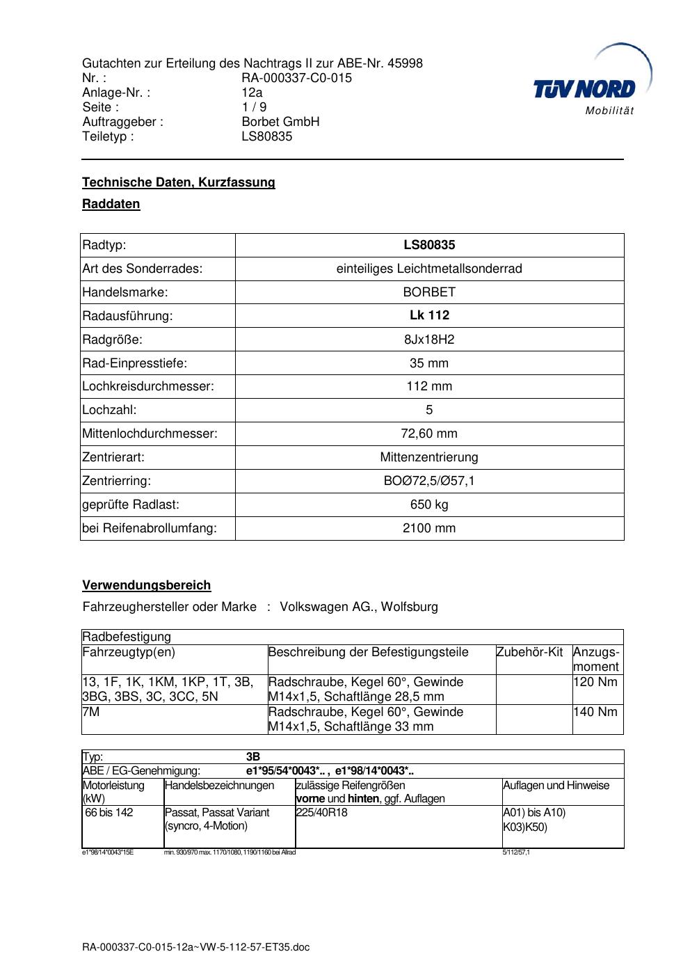 Dieses Gutachten (abe) bezieht sich auf die Alufelge brand-borbet LS80835 in der Ausführung 8Jx18 ET 0, Mittenloch 0 mm (KBA 45998). Im PDF findest du typischerweise zulässige Reifengrößen, Auflagen/Anbauhinweise und – je nach Dokument – Hinweise zur Eintragung.