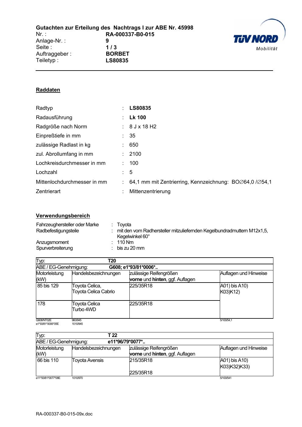 Dieses Gutachten (abe) bezieht sich auf die Alufelge Borbet LS80835 in der Ausführung 8Jx18 ET 0, Mittenloch 0 mm (KBA 45998). Im PDF findest du typischerweise zulässige Reifengrößen, Auflagen/Anbauhinweise und – je nach Dokument – Hinweise zur Eintragung.