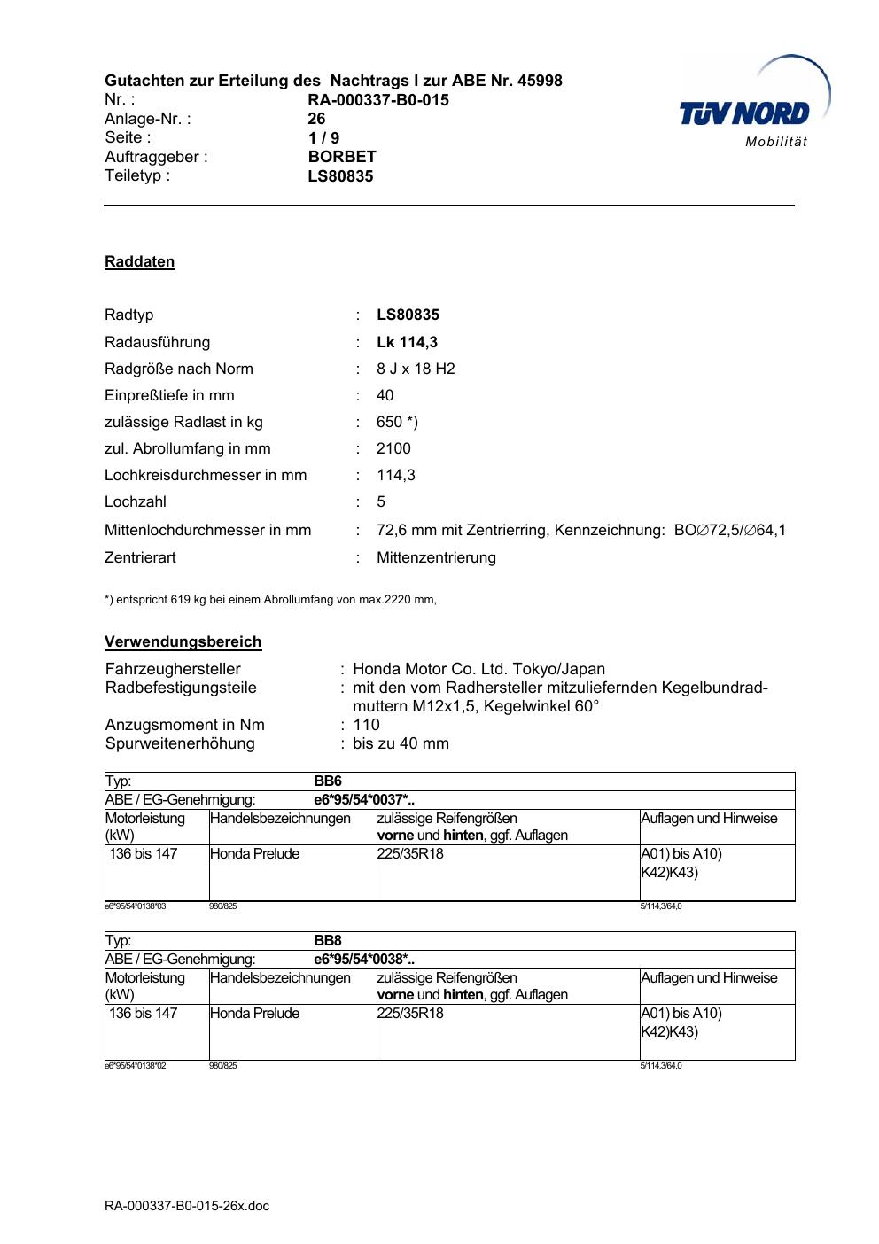 Dieses Gutachten (abe) bezieht sich auf die Alufelge Borbet LS80835 in der Ausführung 8Jx18 ET 0, Mittenloch 0 mm (KBA 45998). Im PDF findest du typischerweise zulässige Reifengrößen, Auflagen/Anbauhinweise und – je nach Dokument – Hinweise zur Eintragung.