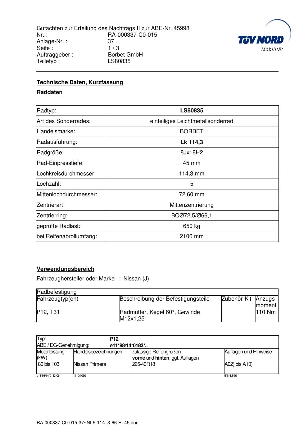 Dieses Gutachten (abe) bezieht sich auf die Alufelge brand-borbet LS80835 in der Ausführung 8Jx18 ET 0, Mittenloch 0 mm (KBA 45998). Im PDF findest du typischerweise zulässige Reifengrößen, Auflagen/Anbauhinweise und – je nach Dokument – Hinweise zur Eintragung.