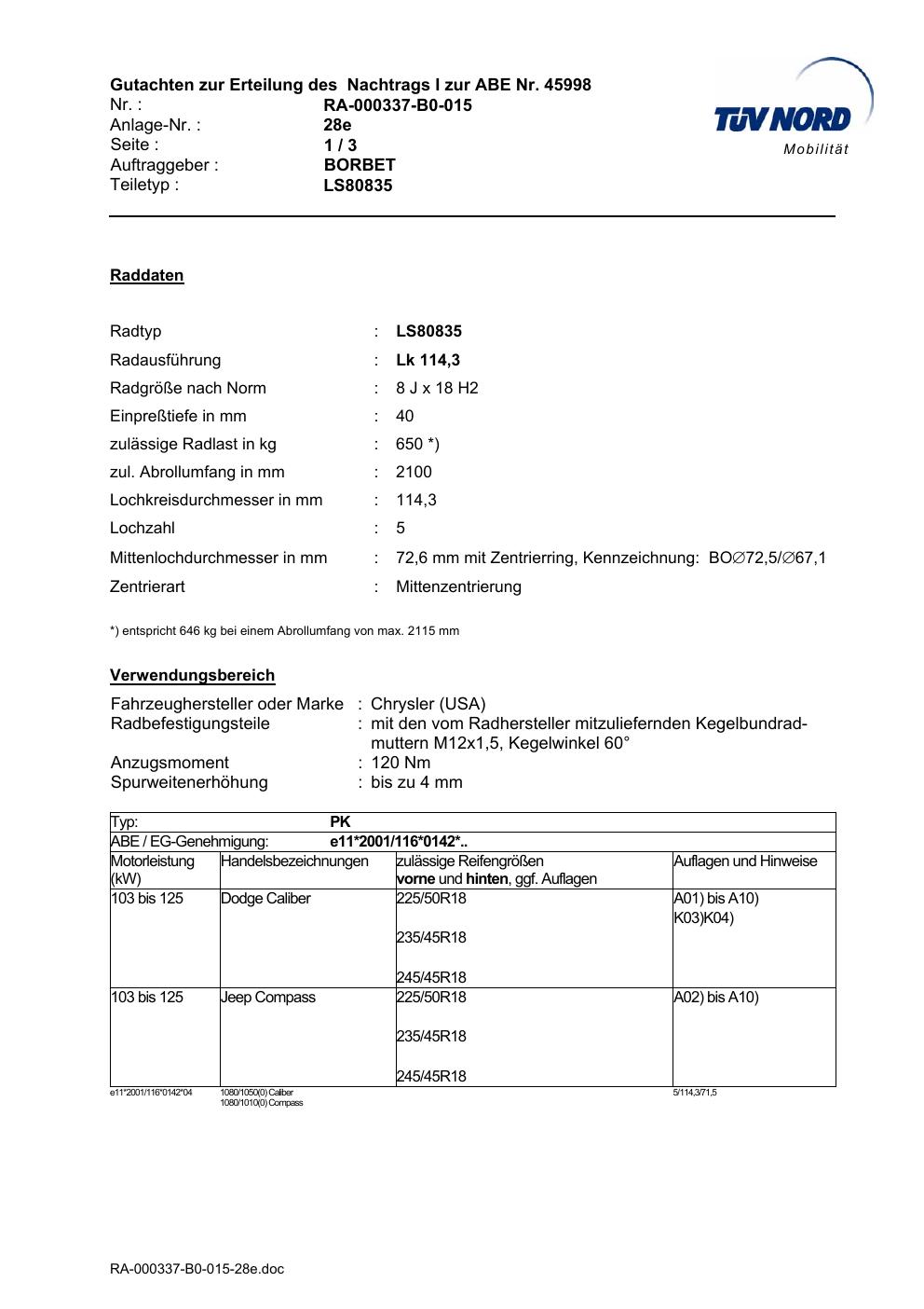 Dieses Gutachten (abe) bezieht sich auf die Alufelge Borbet LS80835 in der Ausführung 8Jx18 ET 0, Mittenloch 0 mm (KBA 45998). Im PDF findest du typischerweise zulässige Reifengrößen, Auflagen/Anbauhinweise und – je nach Dokument – Hinweise zur Eintragung.