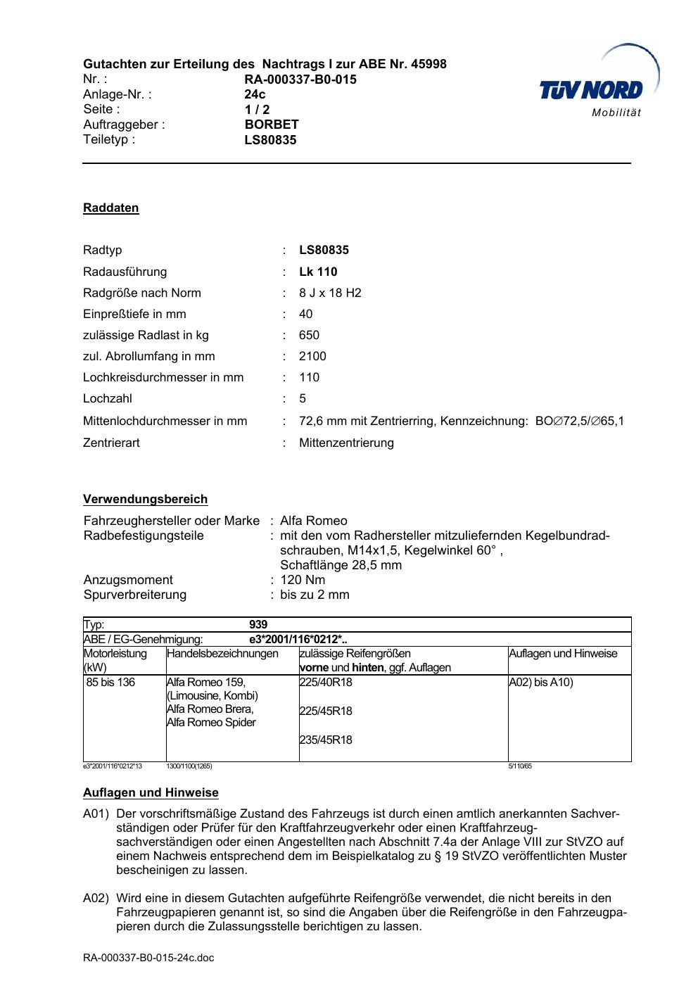 Dieses Gutachten (abe) bezieht sich auf die Alufelge brand-borbet LS80835 in der Ausführung 8Jx18 ET 0, Mittenloch 0 mm (KBA 45998). Im PDF findest du typischerweise zulässige Reifengrößen, Auflagen/Anbauhinweise und – je nach Dokument – Hinweise zur Eintragung.