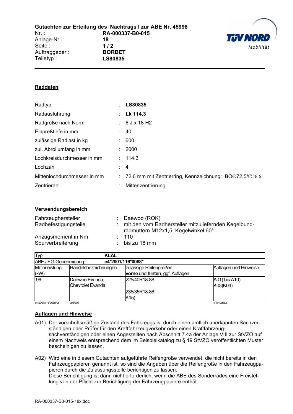 Dieses Gutachten (abe) bezieht sich auf die Alufelge brand-borbet LS80835 in der Ausführung 8Jx18 ET 0, Mittenloch 0 mm (KBA 45998). Im PDF findest du typischerweise zulässige Reifengrößen, Auflagen/Anbauhinweise und – je nach Dokument – Hinweise zur Eintragung.