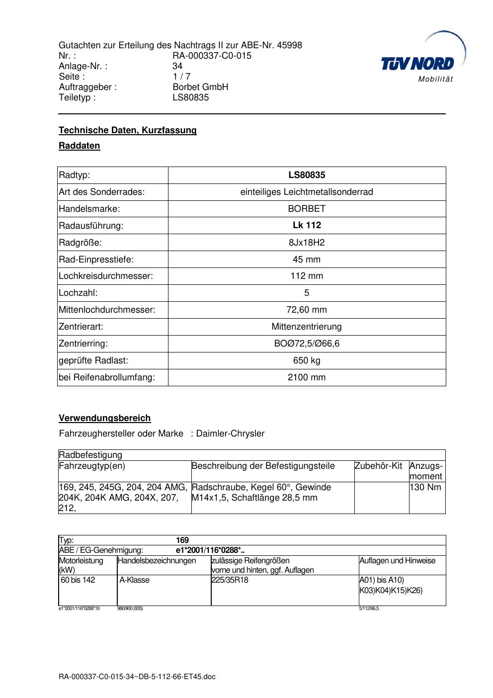 Dieses Gutachten (abe) bezieht sich auf die Alufelge brand-borbet LS80835 in der Ausführung 8Jx18 ET 0, Mittenloch 0 mm (KBA 45998). Im PDF findest du typischerweise zulässige Reifengrößen, Auflagen/Anbauhinweise und – je nach Dokument – Hinweise zur Eintragung.