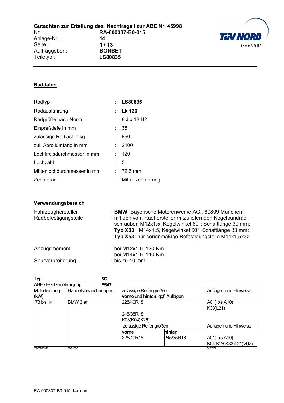 Dieses Gutachten (abe) bezieht sich auf die Alufelge Borbet LS80835 in der Ausführung 8Jx18 ET 0, Mittenloch 0 mm (KBA 45998). Im PDF findest du typischerweise zulässige Reifengrößen, Auflagen/Anbauhinweise und – je nach Dokument – Hinweise zur Eintragung.