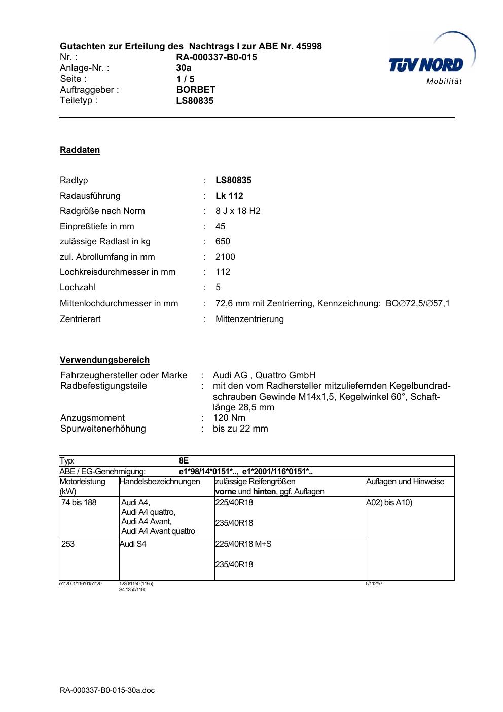 Dieses Gutachten (abe) bezieht sich auf die Alufelge Borbet LS80835 in der Ausführung 8Jx18 ET 0, Mittenloch 0 mm (KBA 45998). Im PDF findest du typischerweise zulässige Reifengrößen, Auflagen/Anbauhinweise und – je nach Dokument – Hinweise zur Eintragung.