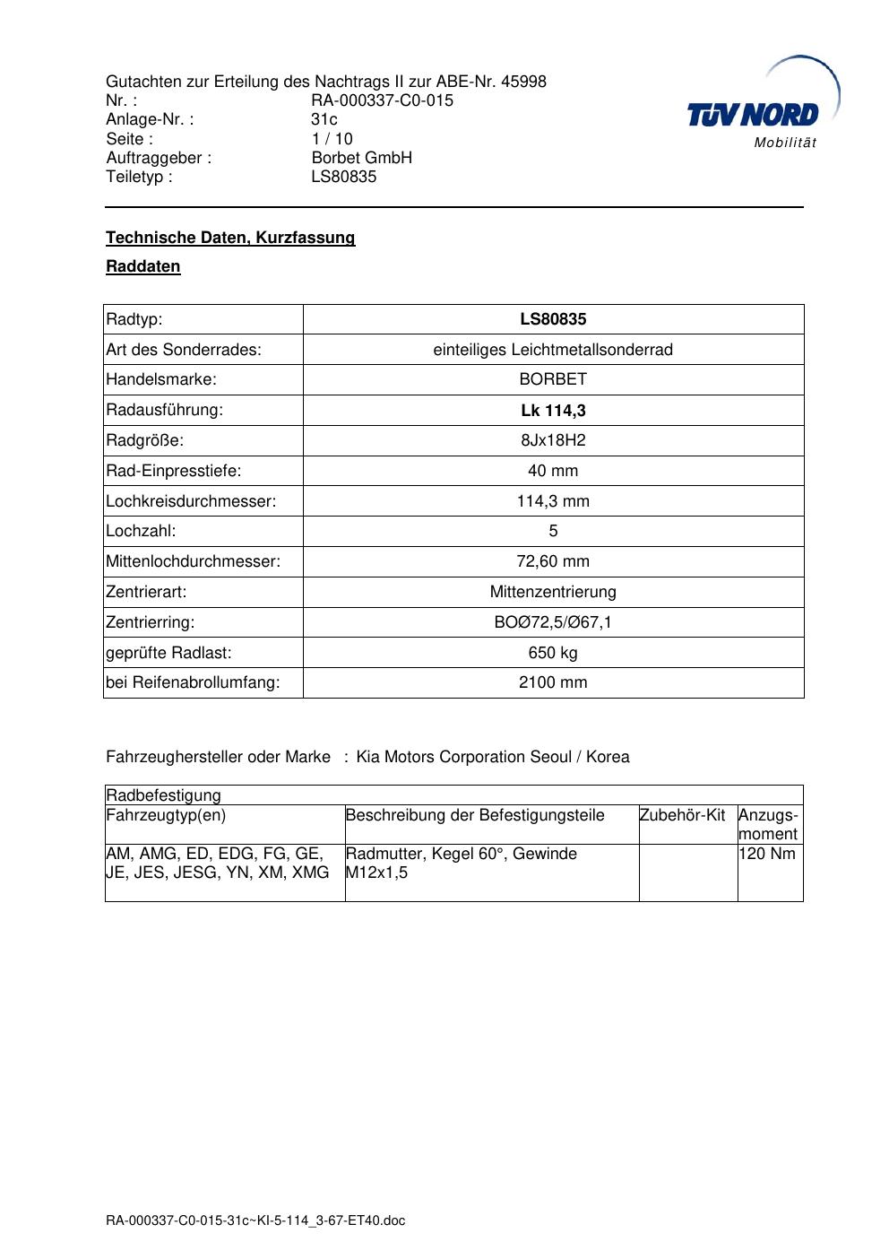 Felgengutachten / abe für Alufelgen brand-borbet LS80835 (8Jx18 ET 0, Mittenloch 0 mm) mit KBA 45998 (Zertifikatsnummer 45998). Hier kostenlos als PDF herunterladen. Der Download-Link ist 24 Stunden gültig und kann bis zu zwei Mal verwendet werden.