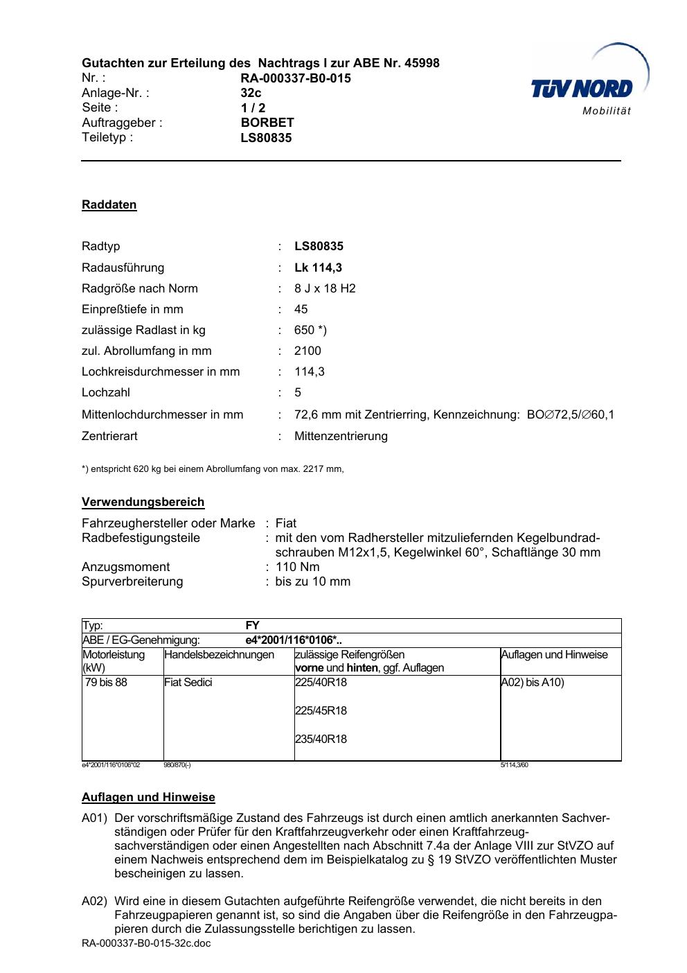 Dieses Gutachten (abe) bezieht sich auf die Alufelge Borbet LS80835 in der Ausführung 8Jx18 ET 0, Mittenloch 0 mm (KBA 45998). Im PDF findest du typischerweise zulässige Reifengrößen, Auflagen/Anbauhinweise und – je nach Dokument – Hinweise zur Eintragung.