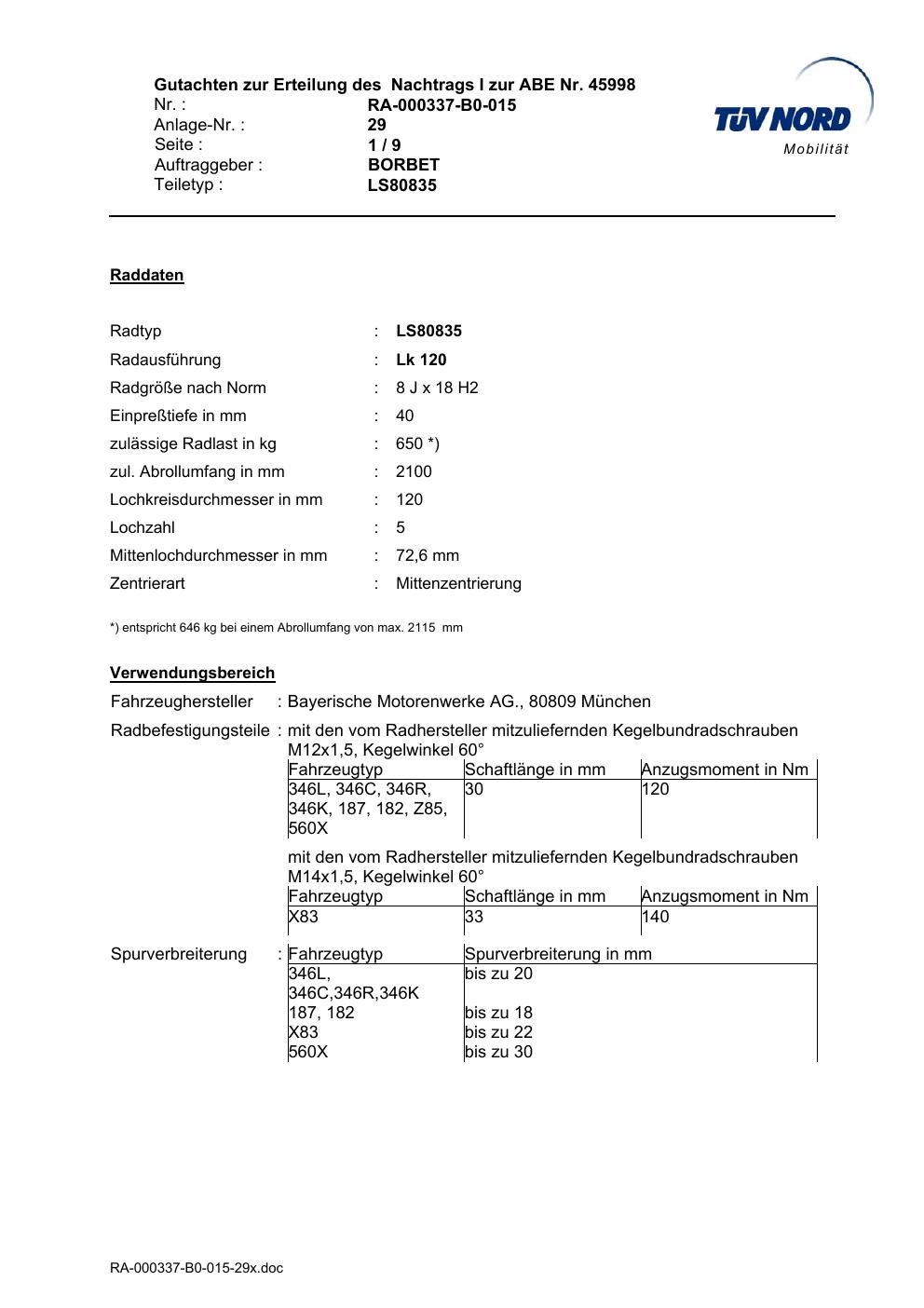 Dieses Gutachten (abe) bezieht sich auf die Alufelge Borbet LS80835 in der Ausführung 8Jx18 ET 0, Mittenloch 0 mm (KBA 45998). Im PDF findest du typischerweise zulässige Reifengrößen, Auflagen/Anbauhinweise und – je nach Dokument – Hinweise zur Eintragung.