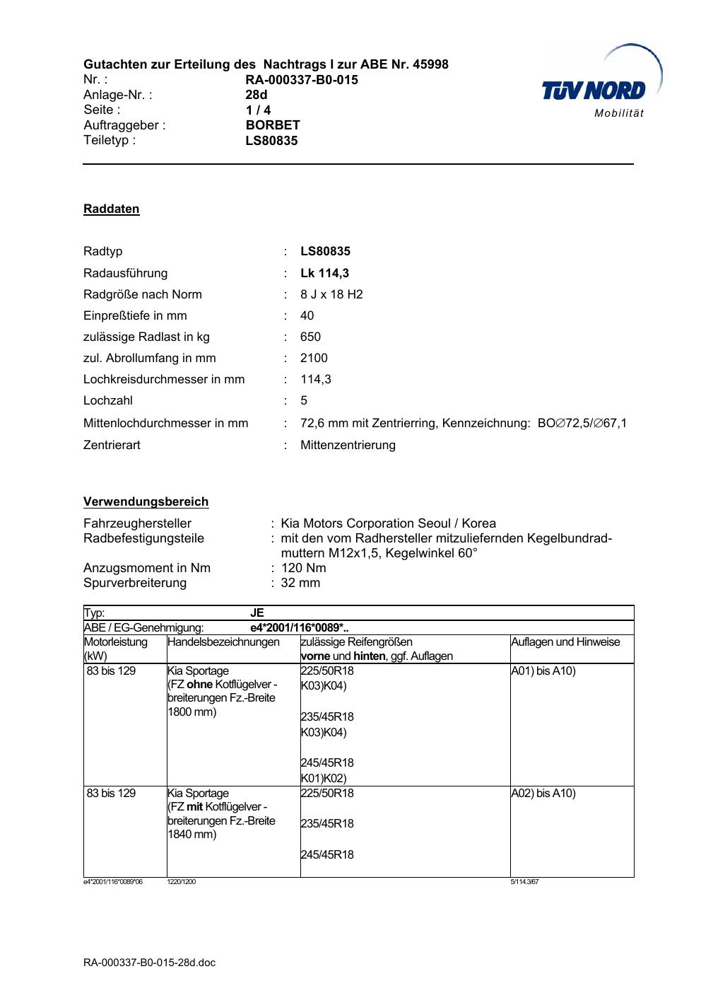 Dieses Gutachten (abe) bezieht sich auf die Alufelge Borbet LS80835 in der Ausführung 8Jx18 ET 0, Mittenloch 0 mm (KBA 45998). Im PDF findest du typischerweise zulässige Reifengrößen, Auflagen/Anbauhinweise und – je nach Dokument – Hinweise zur Eintragung.