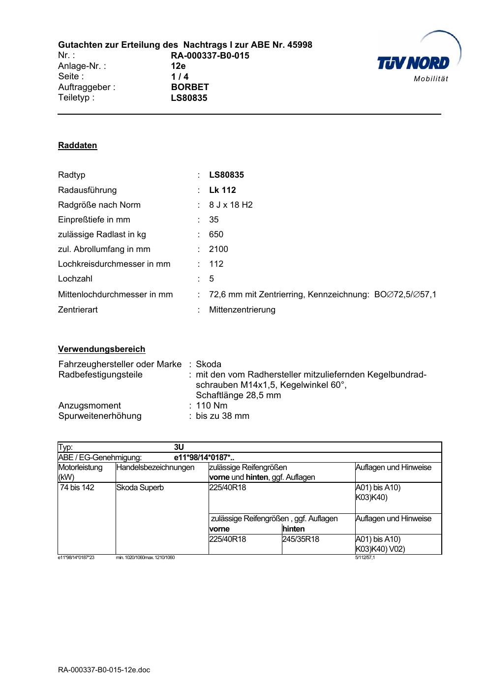 Dieses Gutachten (abe) bezieht sich auf die Alufelge Borbet LS80835 in der Ausführung 8Jx18 ET 0, Mittenloch 0 mm (KBA 45998). Im PDF findest du typischerweise zulässige Reifengrößen, Auflagen/Anbauhinweise und – je nach Dokument – Hinweise zur Eintragung.
