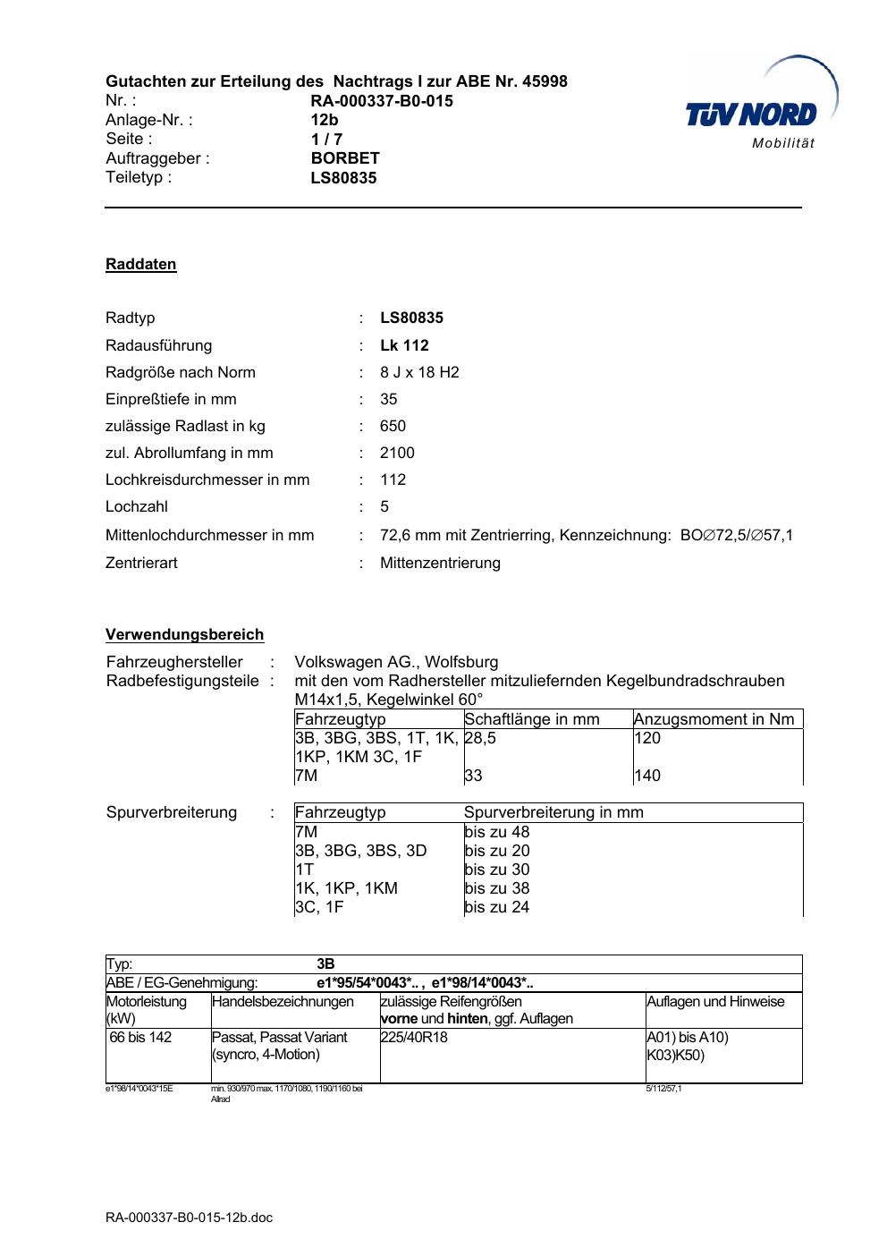 Dieses Gutachten (abe) bezieht sich auf die Alufelge Borbet LS80835 in der Ausführung 8Jx18 ET 0, Mittenloch 0 mm (KBA 45998). Im PDF findest du typischerweise zulässige Reifengrößen, Auflagen/Anbauhinweise und – je nach Dokument – Hinweise zur Eintragung.