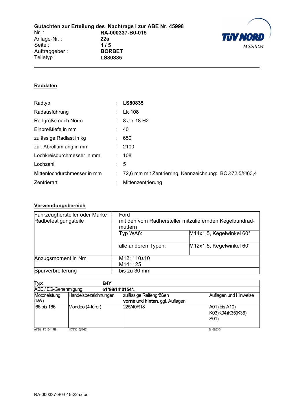 Dieses Gutachten (abe) bezieht sich auf die Alufelge Borbet LS80835 in der Ausführung 8Jx18 ET 0, Mittenloch 0 mm (KBA 45998). Im PDF findest du typischerweise zulässige Reifengrößen, Auflagen/Anbauhinweise und – je nach Dokument – Hinweise zur Eintragung.