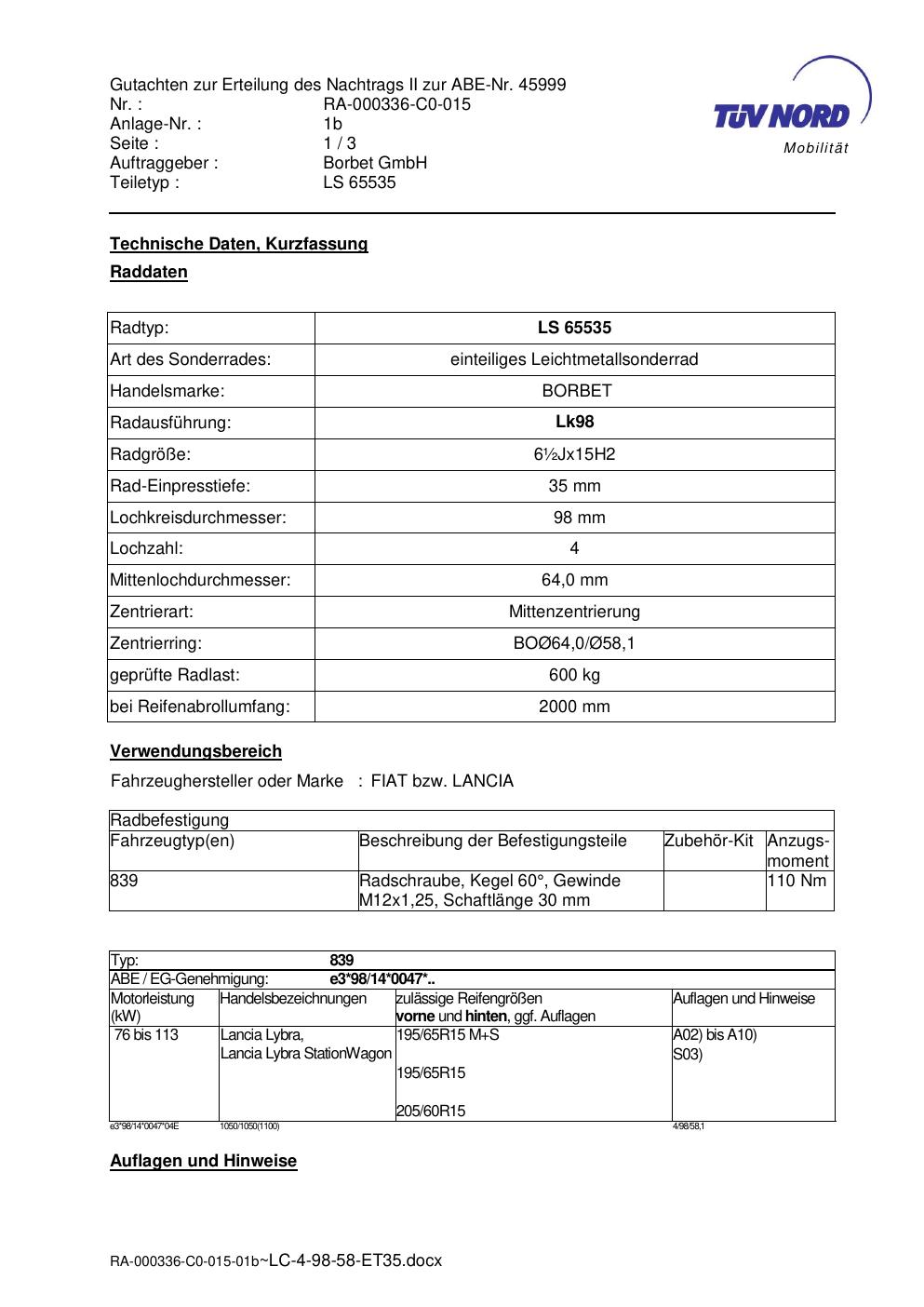 • Stimmt die KBA-Nummer auf der Felge mit diesem Dokument überein?