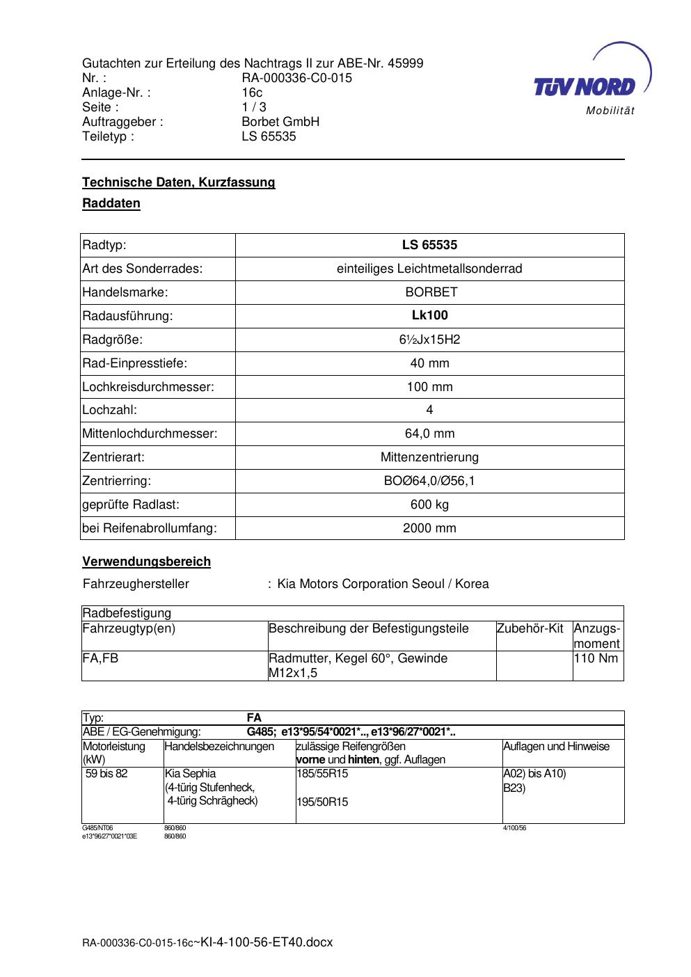 • Stimmt die KBA-Nummer auf der Felge mit diesem Dokument überein?