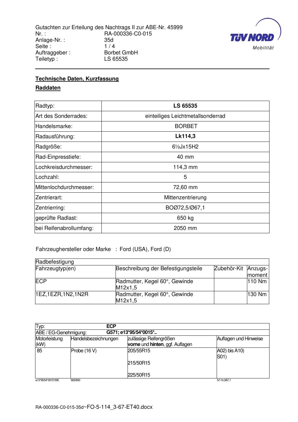 • Stimmt die KBA-Nummer auf der Felge mit diesem Dokument überein?