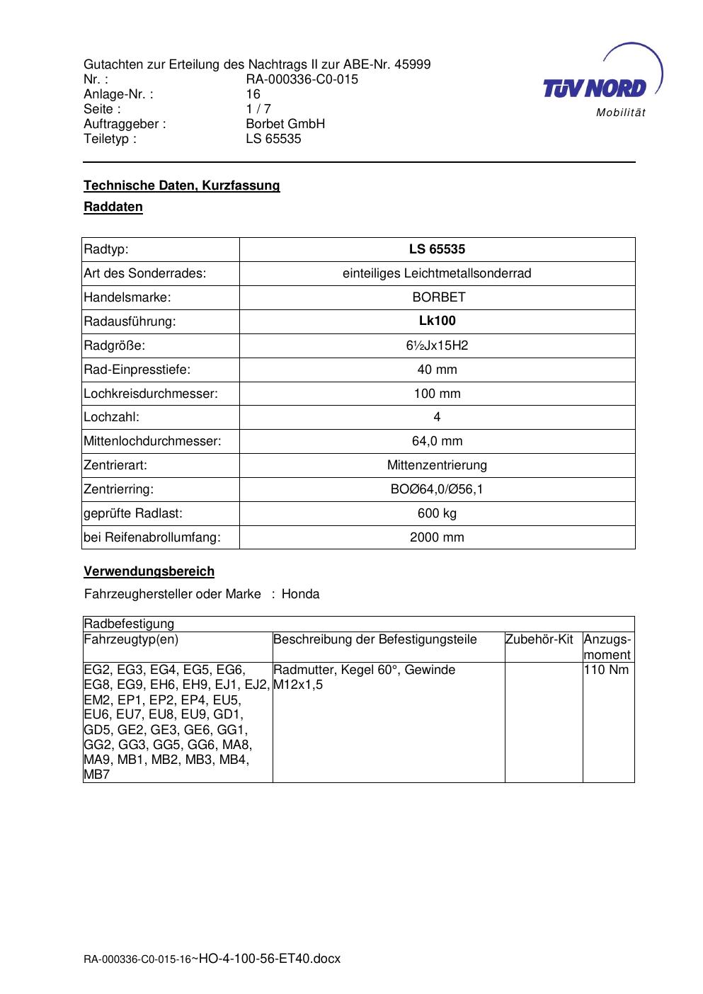 • Stimmt die KBA-Nummer auf der Felge mit diesem Dokument überein?
