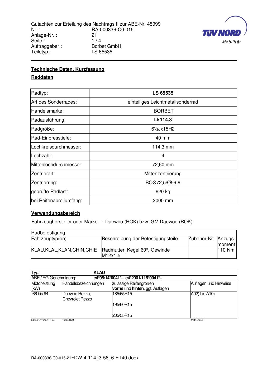 • Stimmt die KBA-Nummer auf der Felge mit diesem Dokument überein?