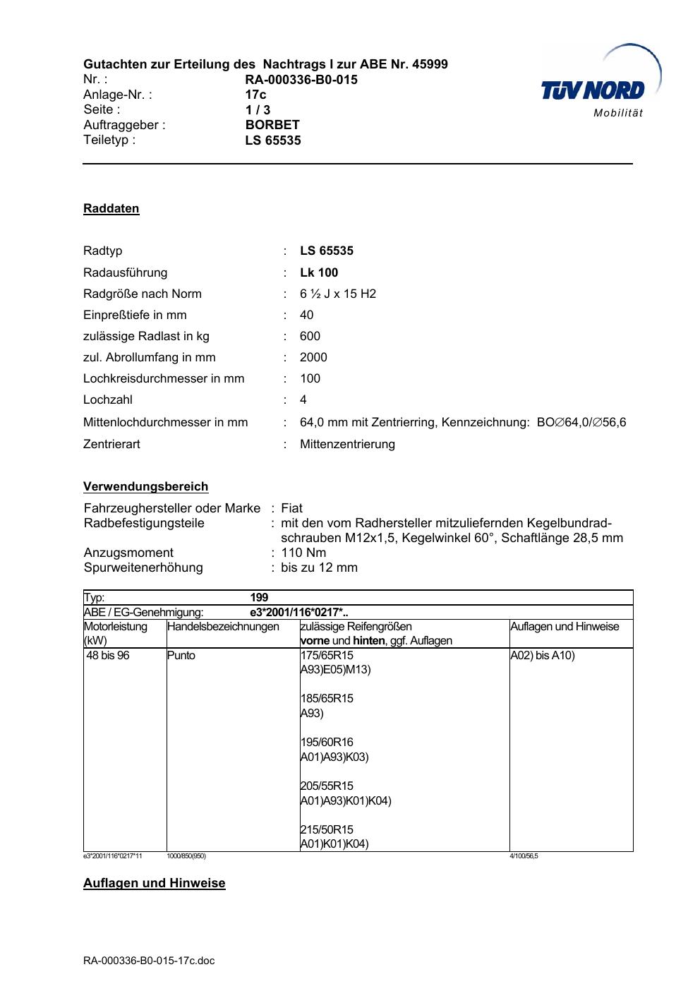 • Stimmt die KBA-Nummer auf der Felge mit diesem Dokument überein?