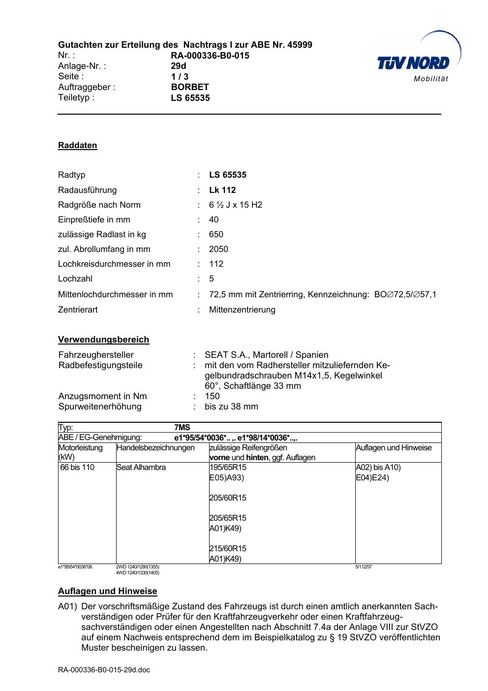 • Stimmt die KBA-Nummer auf der Felge mit diesem Dokument überein?