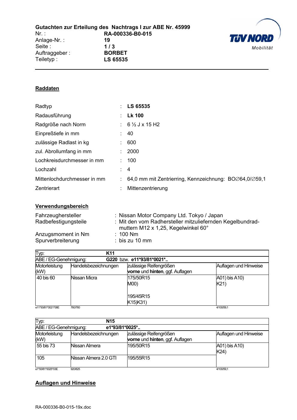 • Stimmt die KBA-Nummer auf der Felge mit diesem Dokument überein?