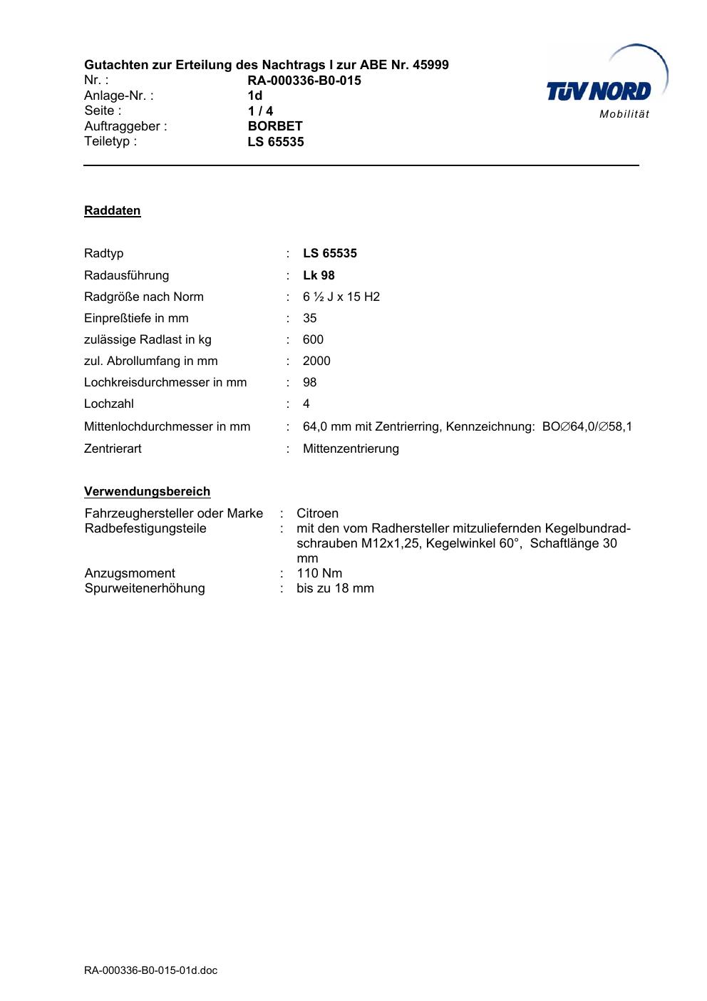 Dieses abe gehört zur Felge Borbet LS 65535 in ET0 mit KBA 45999. Die Seite ist dafür gedacht, dass du schnell prüfen kannst, ob KBA, Design und Größe zu deiner Felge passen und danach direkt das richtige PDF lädst.