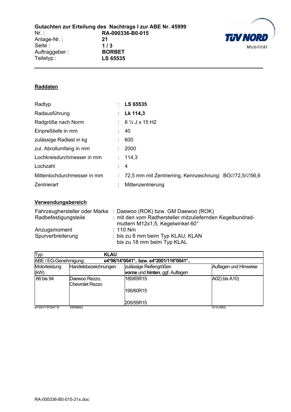 • Stimmt die KBA-Nummer auf der Felge mit diesem Dokument überein?