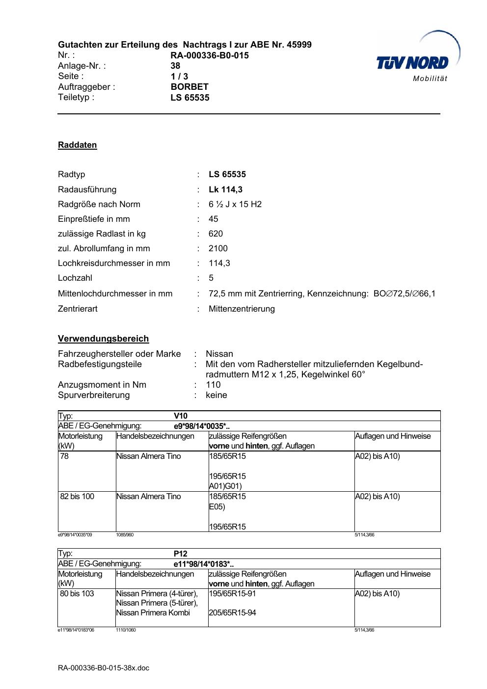 • Stimmt die KBA-Nummer auf der Felge mit diesem Dokument überein?
